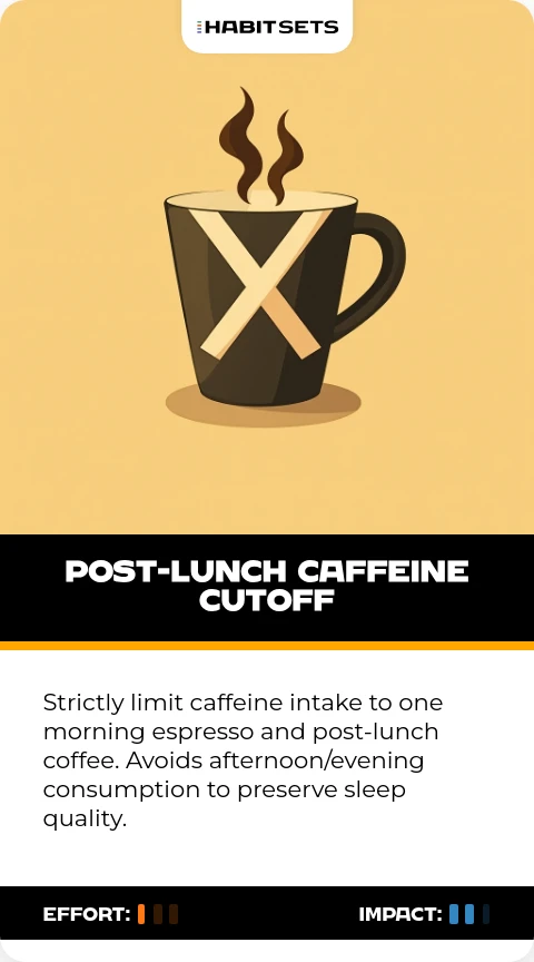 Strictly limit caffeine intake to one morning espresso and post-lunch coffee. Avoids afternoon/evening consumption to preserve sleep quality.