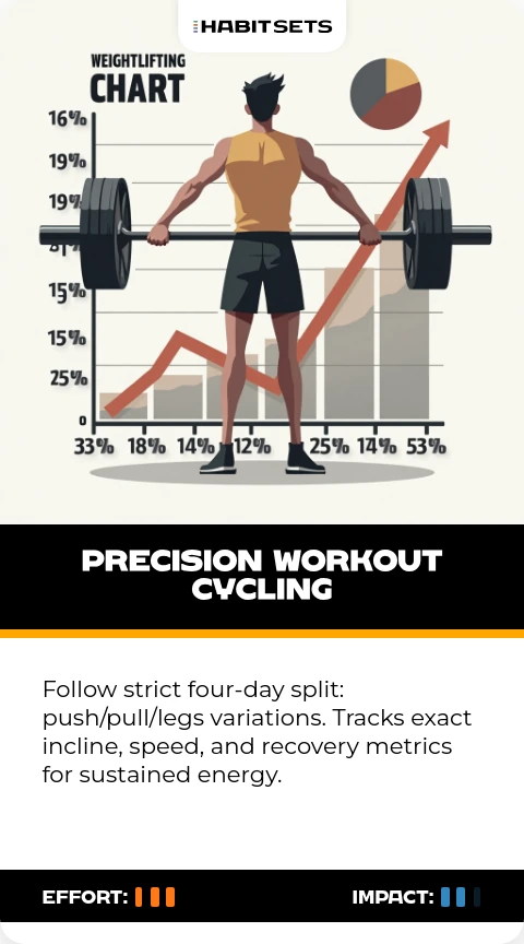 Follow strict four-day split: push/pull/legs variations. Tracks exact incline, speed, and recovery metrics for sustained energy.