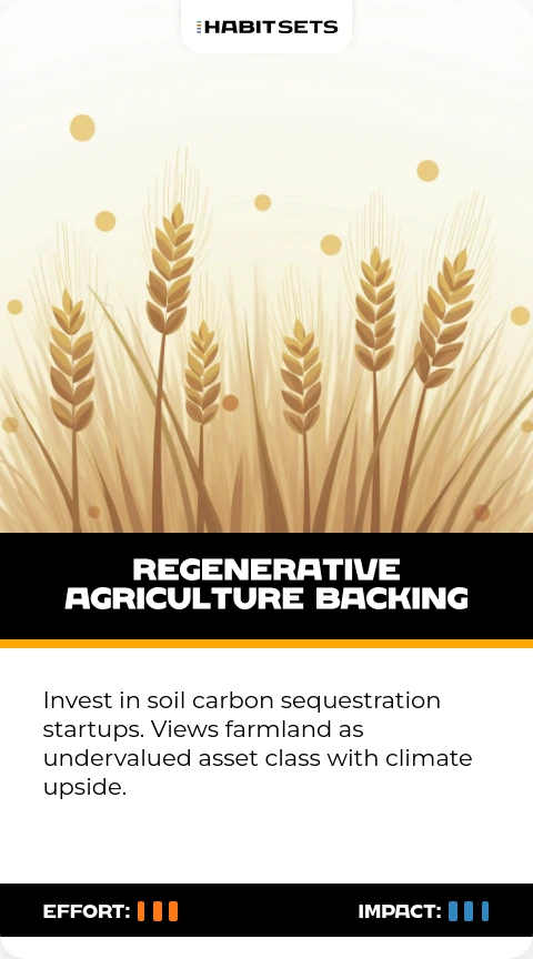 Invest in soil carbon sequestration startups. Views farmland as undervalued asset class with climate upside.