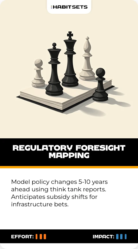 Model policy changes 5-10 years ahead using think tank reports. Anticipates subsidy shifts for infrastructure bets.