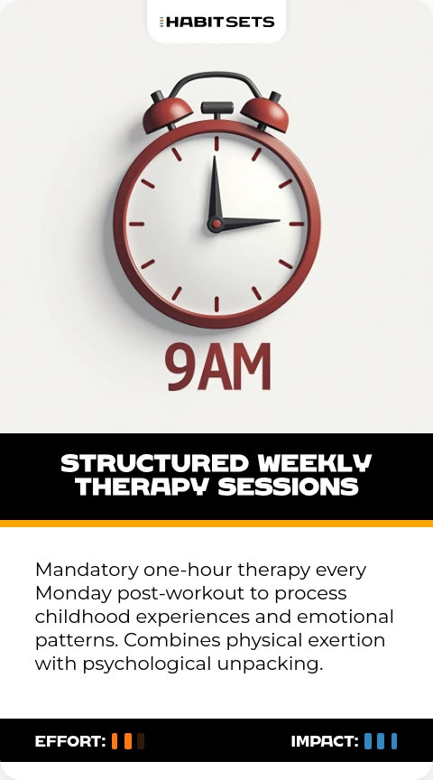 Mandatory one-hour therapy every Monday post-workout to process childhood experiences and emotional patterns. Combines physical exertion with psychological unpacking.