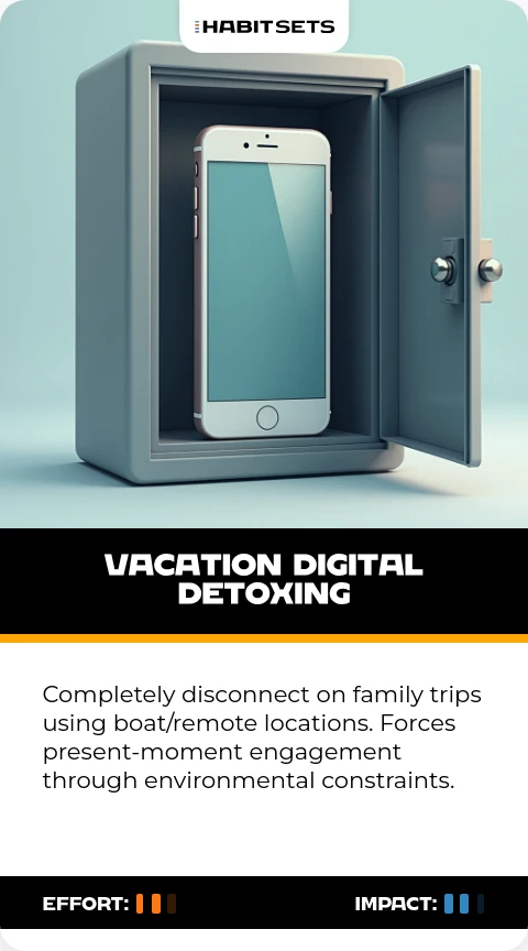 Completely disconnect on family trips using boat/remote locations. Forces present-moment engagement through environmental constraints.