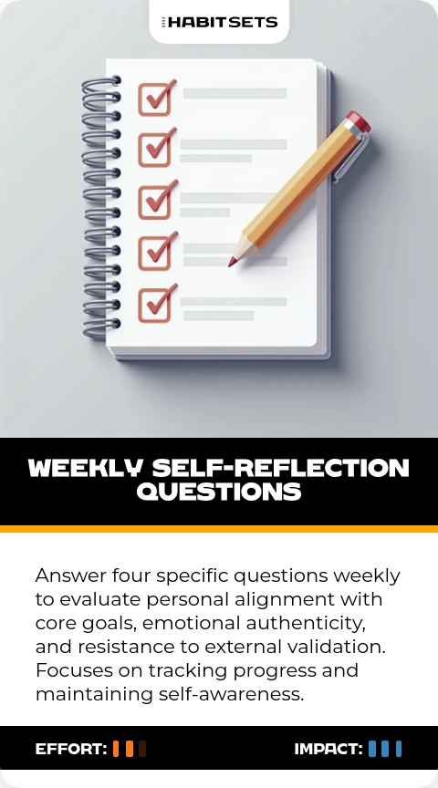 Answer four specific questions weekly to evaluate personal alignment with core goals, emotional authenticity, and resistance to external validation. Focuses on tracking progress and maintaining self-awareness.