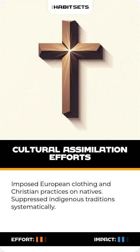 Imposed European clothing and Christian practices on natives. Suppressed indigenous traditions systematically.