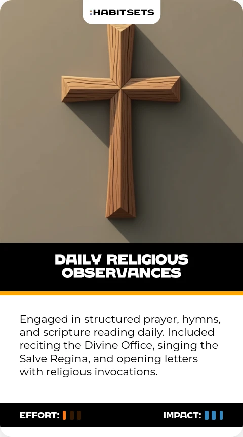Engaged in structured prayer, hymns, and scripture reading daily. Included reciting the Divine Office, singing the Salve Regina, and opening letters with religious invocations.
