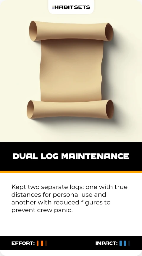 Kept two separate logs: one with true distances for personal use and another with reduced figures to prevent crew panic.