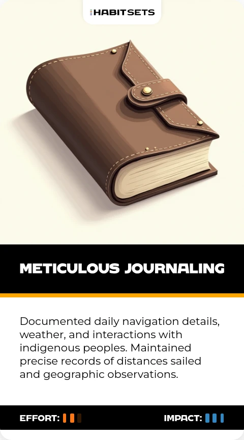 Documented daily navigation details, weather, and interactions with indigenous peoples. Maintained precise records of distances sailed and geographic observations.