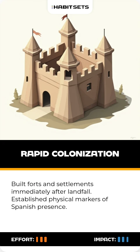 Built forts and settlements immediately after landfall. Established physical markers of Spanish presence.