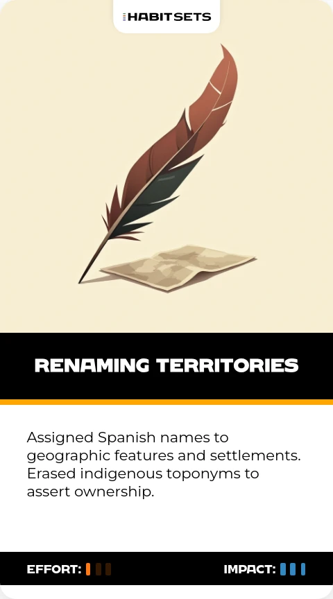 Assigned Spanish names to geographic features and settlements. Erased indigenous toponyms to assert ownership.