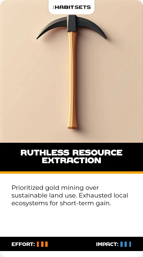 Prioritized gold mining over sustainable land use. Exhausted local ecosystems for short-term gain.