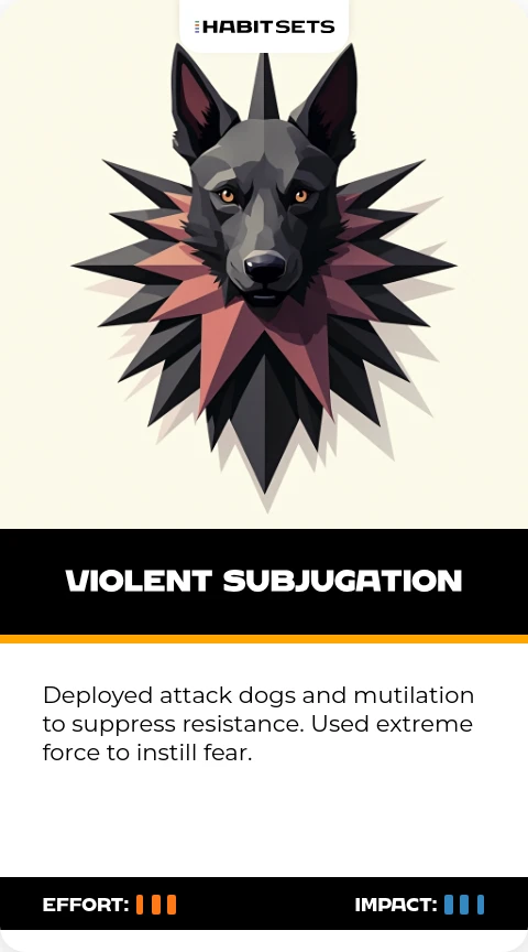 Deployed attack dogs and mutilation to suppress resistance. Used extreme force to instill fear.