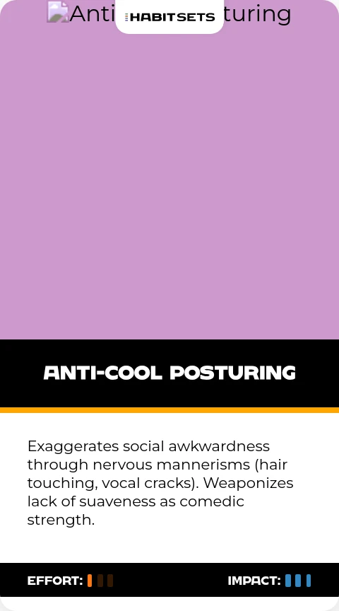 Exaggerates social awkwardness through nervous mannerisms (hair touching, vocal cracks). Weaponizes lack of suaveness as comedic strength.