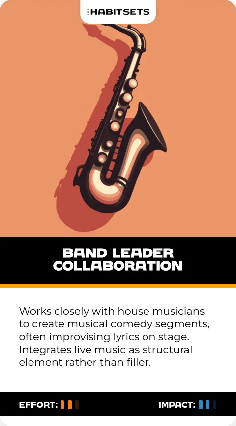 Works closely with house musicians to create musical comedy segments, often improvising lyrics on stage. Integrates live music as structural element rather than filler.