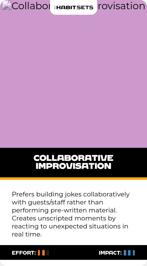 Prefers building jokes collaboratively with guests/staff rather than performing pre-written material. Creates unscripted moments by reacting to unexpected situations in real time.