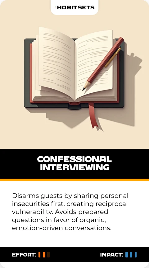 Disarms guests by sharing personal insecurities first, creating reciprocal vulnerability. Avoids prepared questions in favor of organic, emotion-driven conversations.