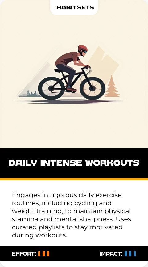 Engages in rigorous daily exercise routines, including cycling and weight training, to maintain physical stamina and mental sharpness. Uses curated playlists to stay motivated during workouts.