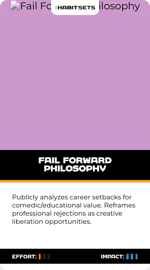 Publicly analyzes career setbacks for comedic/educational value. Reframes professional rejections as creative liberation opportunities.