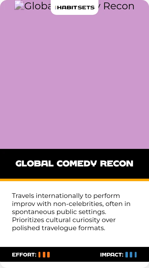 Travels internationally to perform improv with non-celebrities, often in spontaneous public settings. Prioritizes cultural curiosity over polished travelogue formats.