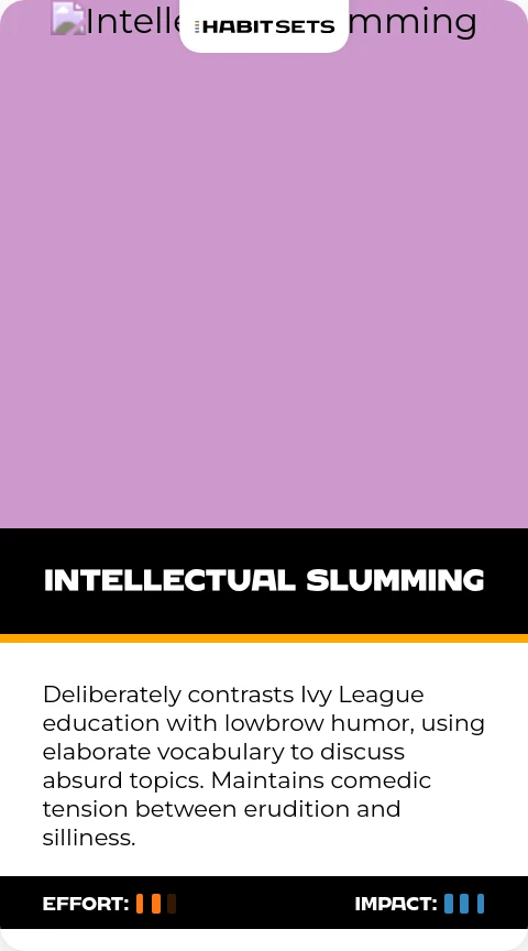 Deliberately contrasts Ivy League education with lowbrow humor, using elaborate vocabulary to discuss absurd topics. Maintains comedic tension between erudition and silliness.