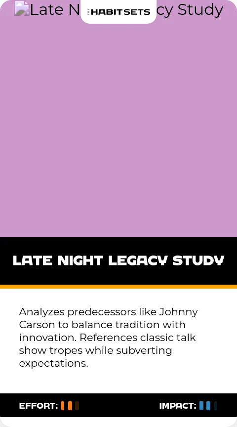Analyzes predecessors like Johnny Carson to balance tradition with innovation. References classic talk show tropes while subverting expectations.