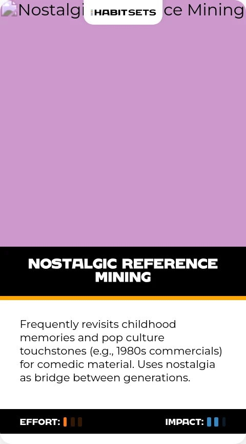 Frequently revisits childhood memories and pop culture touchstones (e.g., 1980s commercials) for comedic material. Uses nostalgia as bridge between generations.