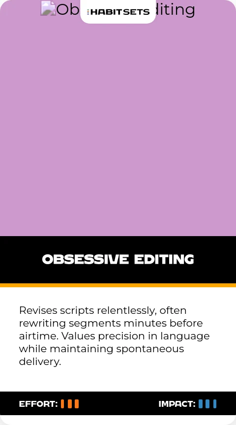 Revises scripts relentlessly, often rewriting segments minutes before airtime. Values precision in language while maintaining spontaneous delivery.