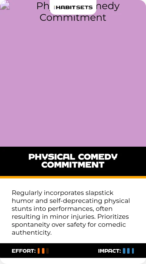 Regularly incorporates slapstick humor and self-deprecating physical stunts into performances, often resulting in minor injuries. Prioritizes spontaneity over safety for comedic authenticity.
