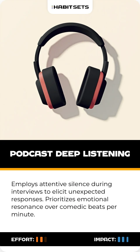 Employs attentive silence during interviews to elicit unexpected responses. Prioritizes emotional resonance over comedic beats per minute.