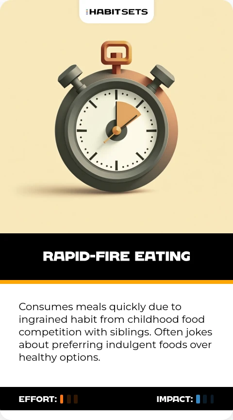 Consumes meals quickly due to ingrained habit from childhood food competition with siblings. Often jokes about preferring indulgent foods over healthy options.