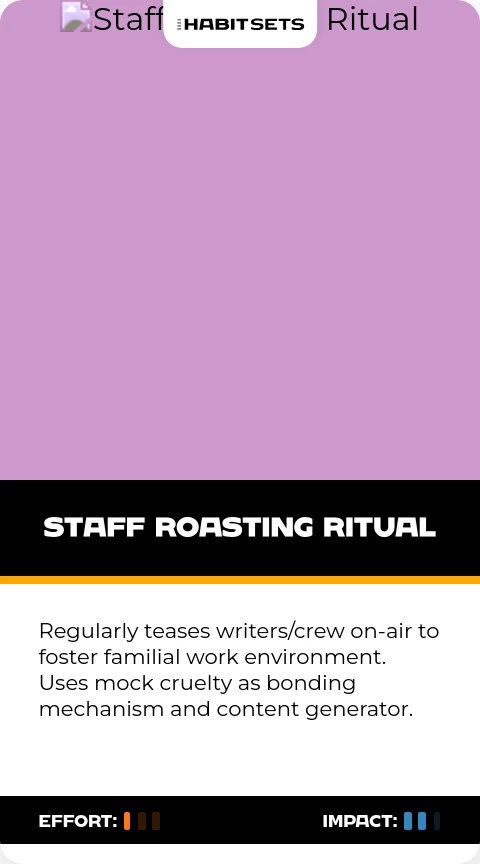 Regularly teases writers/crew on-air to foster familial work environment. Uses mock cruelty as bonding mechanism and content generator.