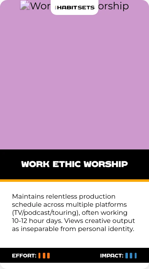 Maintains relentless production schedule across multiple platforms (TV/podcast/touring), often working 10-12 hour days. Views creative output as inseparable from personal identity.