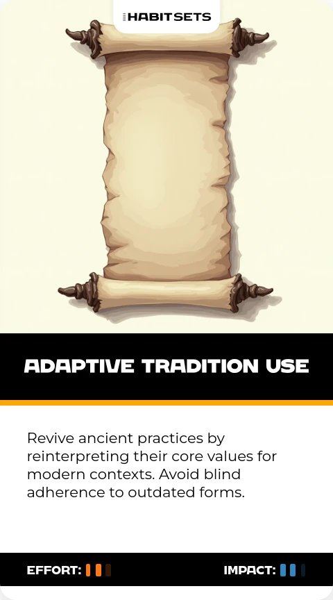 Revive ancient practices by reinterpreting their core values for modern contexts. Avoid blind adherence to outdated forms.