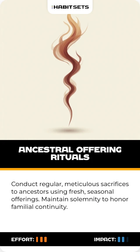 Conduct regular, meticulous sacrifices to ancestors using fresh, seasonal offerings. Maintain solemnity to honor familial continuity.