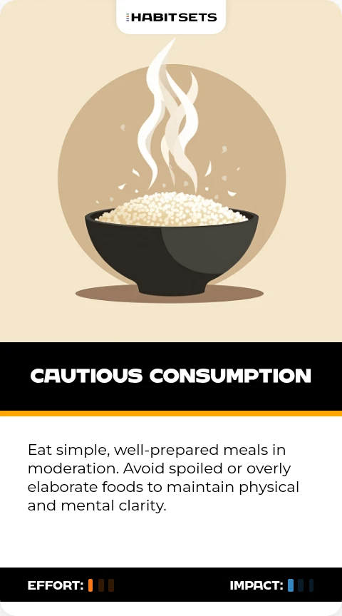 Eat simple, well-prepared meals in moderation. Avoid spoiled or overly elaborate foods to maintain physical and mental clarity.