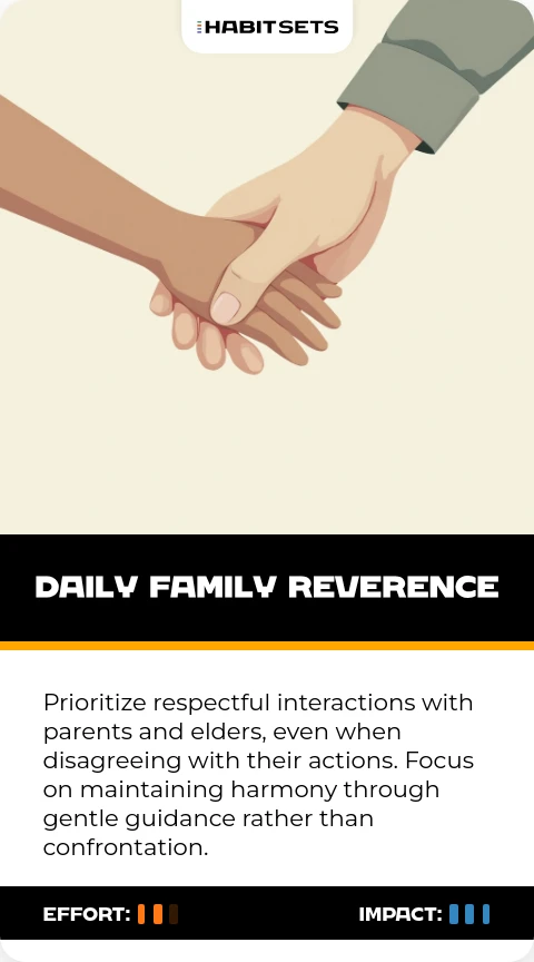 Prioritize respectful interactions with parents and elders, even when disagreeing with their actions. Focus on maintaining harmony through gentle guidance rather than confrontation.