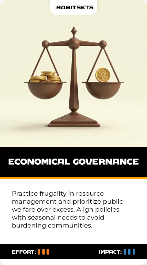Practice frugality in resource management and prioritize public welfare over excess. Align policies with seasonal needs to avoid burdening communities.