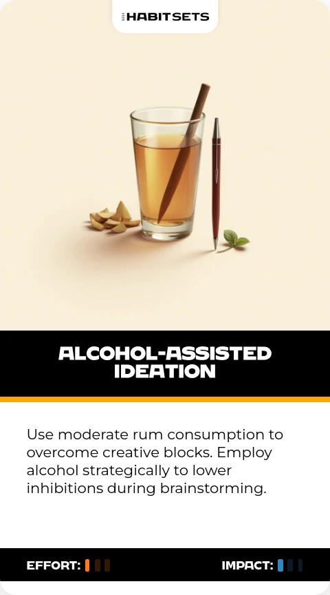 Use moderate rum consumption to overcome creative blocks. Employ alcohol strategically to lower inhibitions during brainstorming.