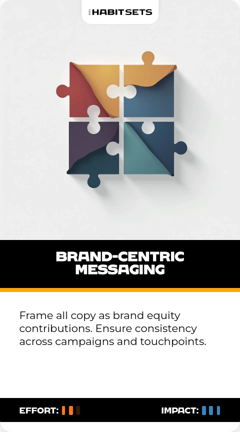 Frame all copy as brand equity contributions. Ensure consistency across campaigns and touchpoints.