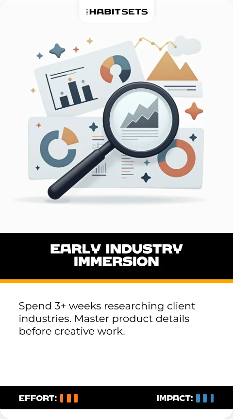 Spend 3+ weeks researching client industries. Master product details before creative work.
