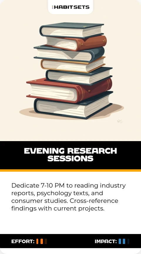 Dedicate 7-10 PM to reading industry reports, psychology texts, and consumer studies. Cross-reference findings with current projects.