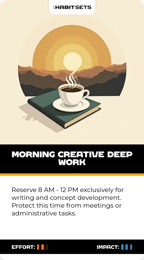 Reserve 8 AM - 12 PM exclusively for writing and concept development. Protect this time from meetings or administrative tasks.