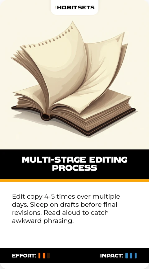 Edit copy 4-5 times over multiple days. Sleep on drafts before final revisions. Read aloud to catch awkward phrasing.
