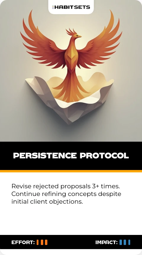 Revise rejected proposals 3+ times. Continue refining concepts despite initial client objections.