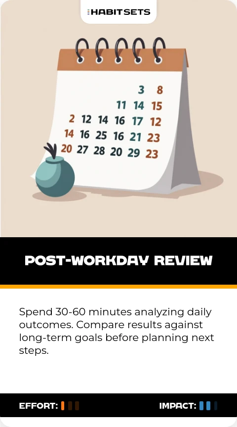 Spend 30-60 minutes analyzing daily outcomes. Compare results against long-term goals before planning next steps.