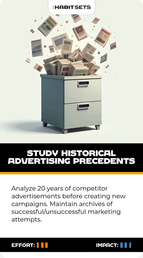Analyze 20 years of competitor advertisements before creating new campaigns. Maintain archives of successful/unsuccessful marketing attempts.