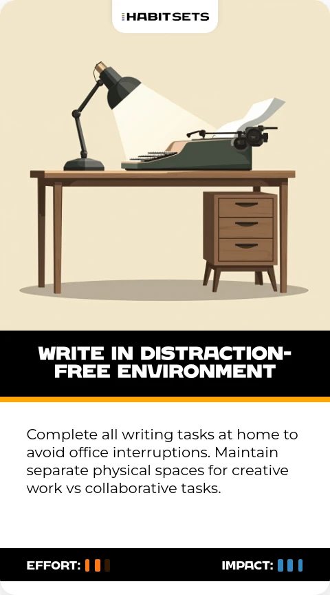 Complete all writing tasks at home to avoid office interruptions. Maintain separate physical spaces for creative work vs collaborative tasks.