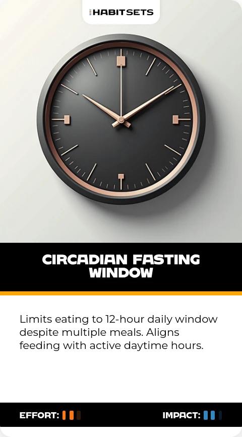 Limits eating to 12-hour daily window despite multiple meals. Aligns feeding with active daytime hours.