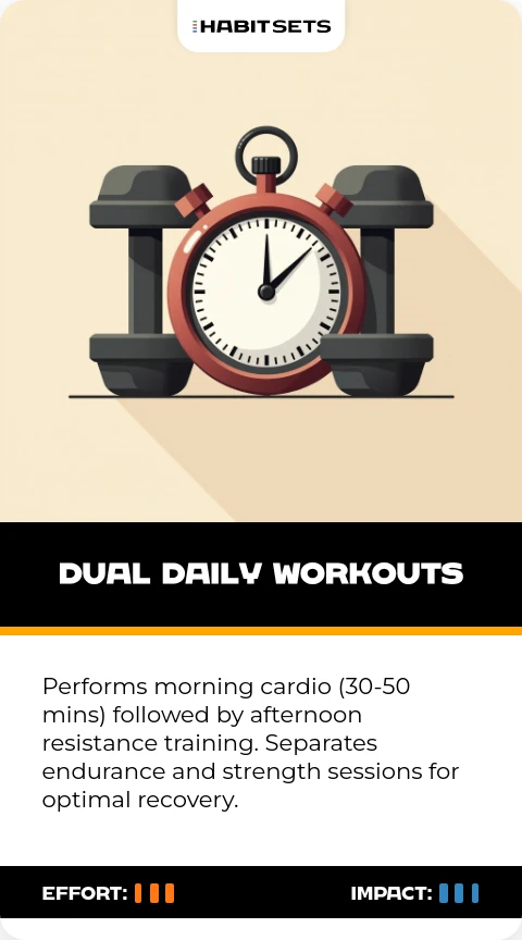 Performs morning cardio (30-50 mins) followed by afternoon resistance training. Separates endurance and strength sessions for optimal recovery.