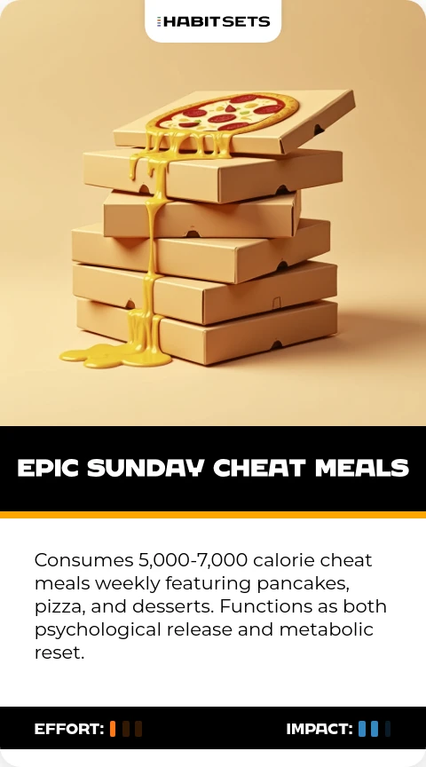 Consumes 5,000-7,000 calorie cheat meals weekly featuring pancakes, pizza, and desserts. Functions as both psychological release and metabolic reset.