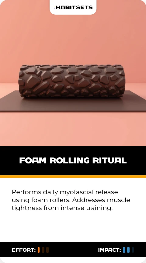 Performs daily myofascial release using foam rollers. Addresses muscle tightness from intense training.